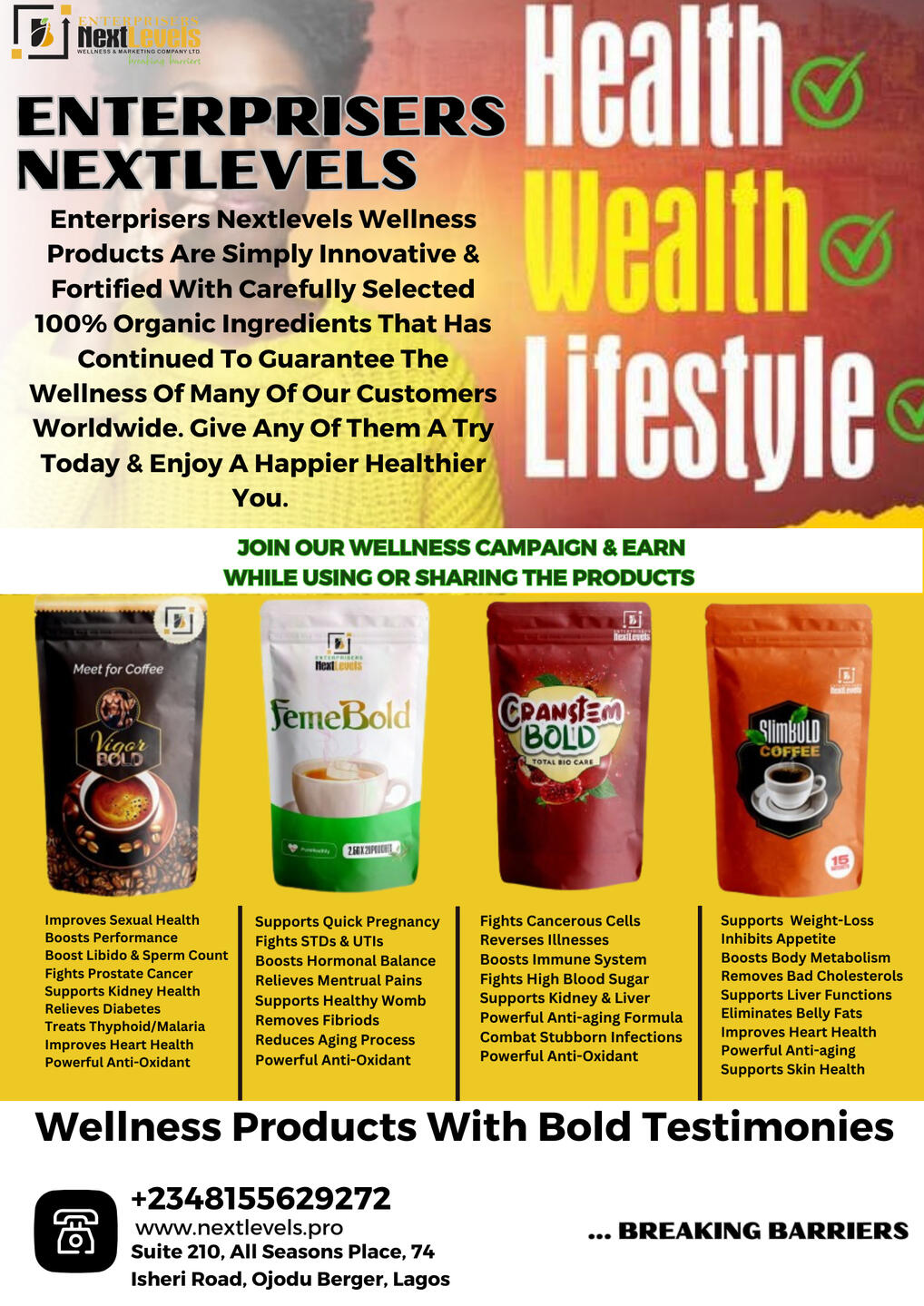 Your first wealth is a vibrant health. This is why at Enterprisers NextLevels company we are extremely happy when we provide you with the consultation and support that can help you resolve your health challenge using our clinically tested, all-natural wellness products that produces bold testimonies for users worldwide